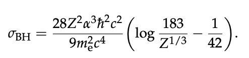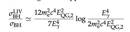 Here Z is the atomic number of the nucleus, α is the fine structure constant, and me is the electron mass. In the LIV scenario, the cross section will not change significantly for superluminal photons, unless the threshold for photon decay is reached. However, in that case, the photon decay will be the dominant process, making the LIV influence on the B-H process negligible. On the other hand, if photons are subluminal, the B-H cross section becomes strongly suppressed, leading to the suppression factor
